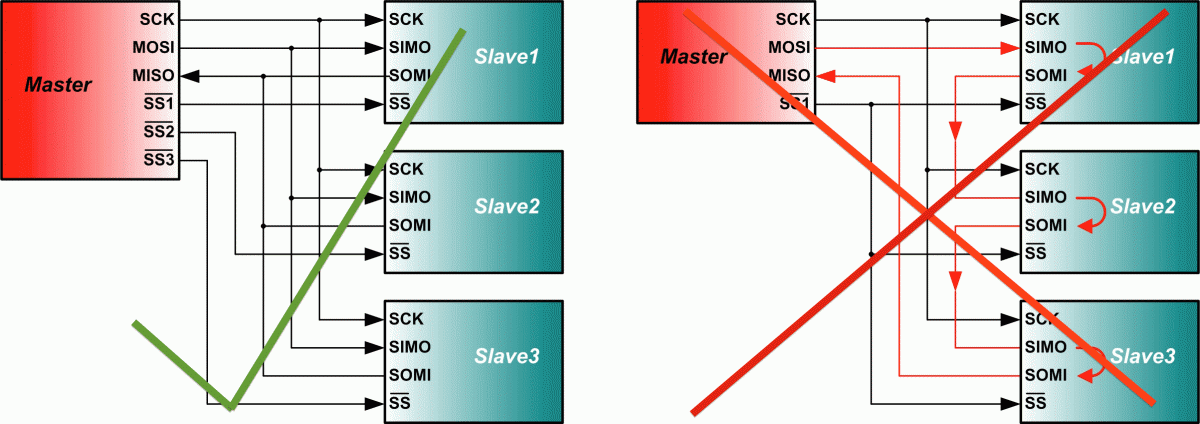 Basically the two devices share Serial In (MOSI) , Serial Out (MISO) and Serial Clock (SCK) signals but each have individual Slave Select (SS) signals. The attached picture illustrates this pretty well.