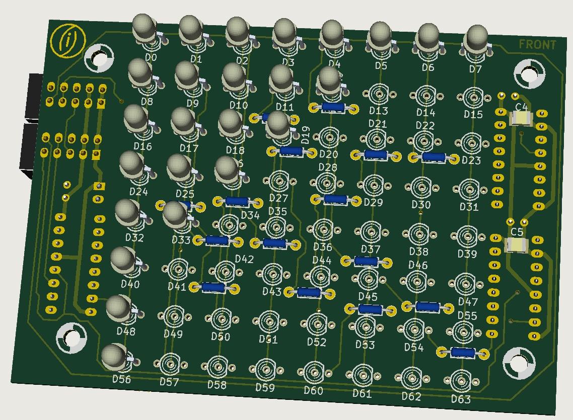 …excellent news! the duo-led-matrix-board looks quit neat. just one question: is the copper rest ring for the duo-leds big enough ? on the picture (bottom side) it looks like its too small and then it gets diffcult to solder. usually i add 30 mil to the hole-size, which gives me a 15mil copper rest-ring around the hole. with that i get good solder results. not sure how to do that in kicad, but im quite sure, that you can setup the pad-sizes somewhere. also i like the sil-header format. 10-pin is what i use for my projects as well.