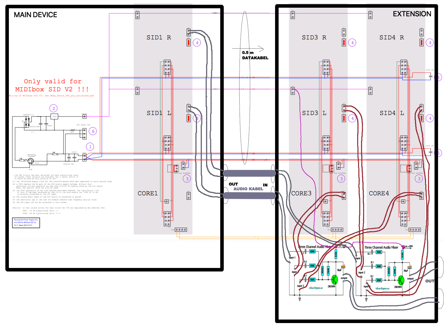 Ich habe nochmal zur Veranschaulichung die Verbindungen (verbessert) aufgezeichnet. Vielleicht wird es dadurch etwas klarer. Das Brummen kommt auch, wenn ich gar nicht die Mixerschaltung (mit Strom und Audio) anschliesse und direkt den Audioausgang des SID1 Paares abhöre (jedoch die beiden SID Paare 3 und 4 übers Datakabel angeschlossen hab). Das Brummen ist halt dann nur nicht so laut.