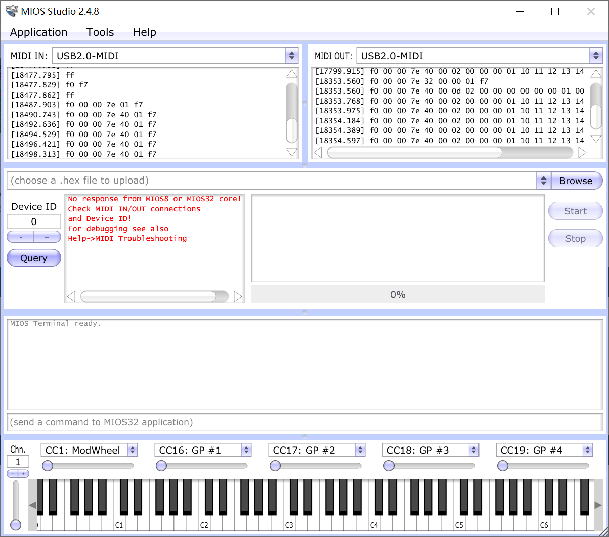 So now I uploaded the NG template project, because this is what I would want to be working with, then the uplaod stops halfway and I get the error message seen above. Upon restarting I can now choose MIDIbox NG in the In/Out section in MIOS Studio, but still the same error. Pushing the black knob on the core module didn’t do anything either, except for the sound on Windows that says that spomething has been removed and then re-attached.