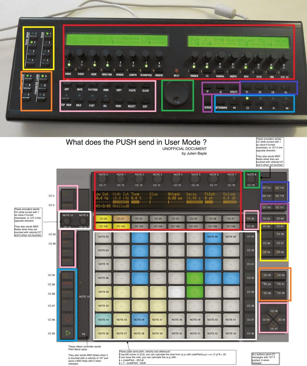 The Buttons in the Pink square on the midi box are 14 in the push we have 12 available according the pic below so we miss 2 buttons but we also have the line of 8 buttons available ( cc36-cc43) but I guess we can leave this as is because they mark time divisions and I guess this could be usefull with the same purpose on the seqv4, so if this was the case we have just 2 buttons left from the seqv4 layout, I havent play yet with the seqv4 so please advice if we can leave 2 buttons out jejeje or put some shift something