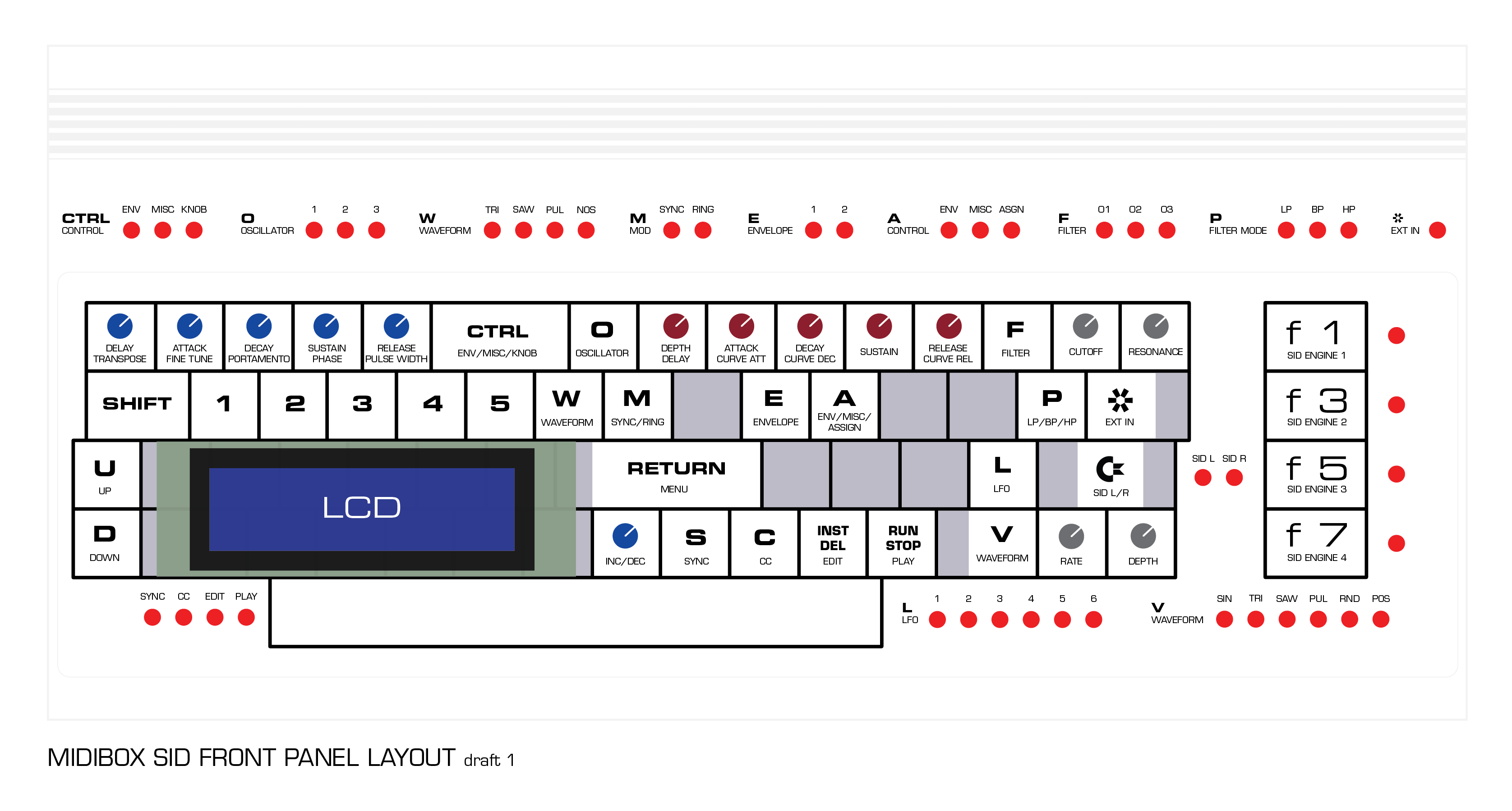 My MIDIBOX SID build is using the MB-6582 main board and a custom control surface. I’m building it inside a VIC-20 case and the control surface is built on a modified keyboard using the keys as buttons. The encoders I got push up through the holes in the keyboard tray. Due to a lack of room I’m not including the matrix. LEDs are placed around the keyboard area and my attached layout shows where I’m thinking of putting them.