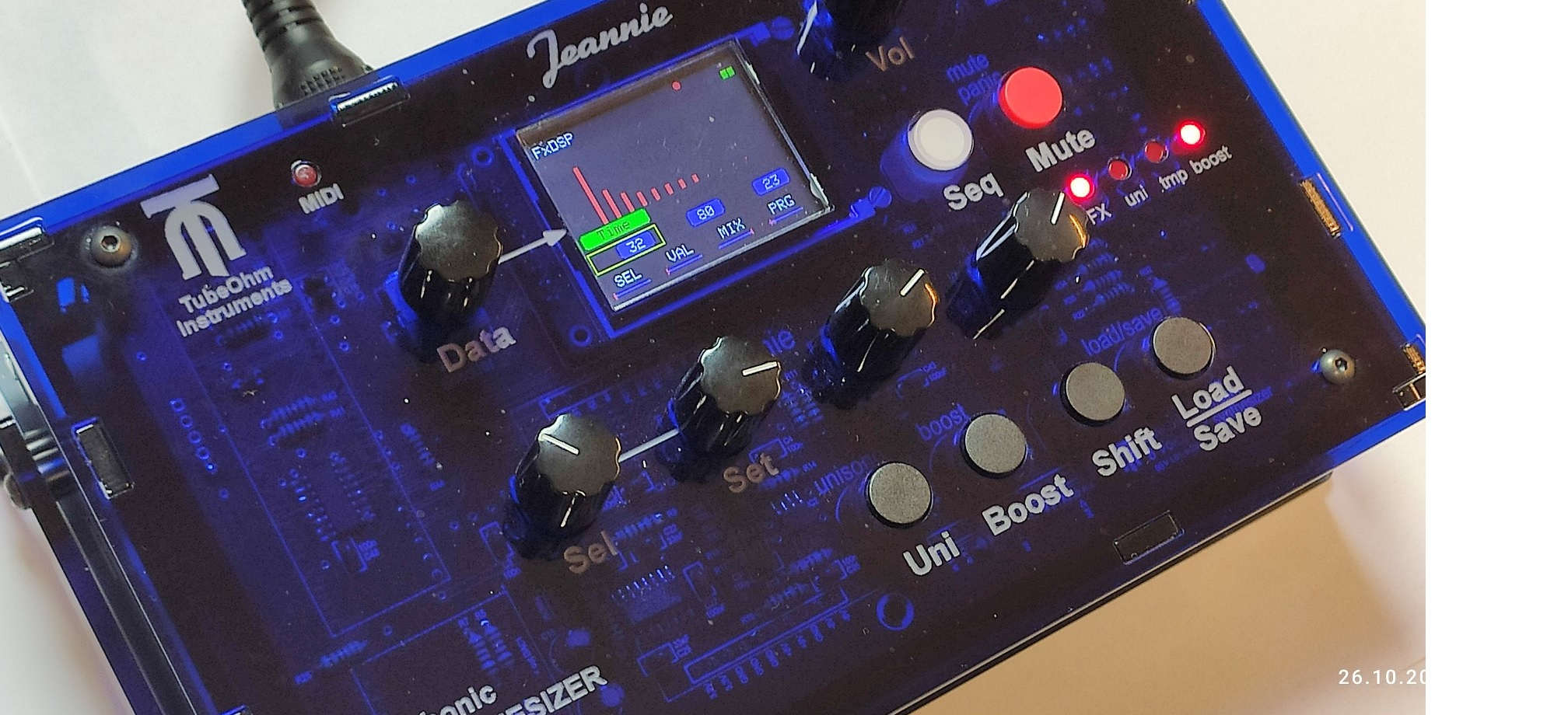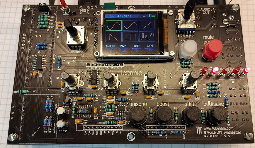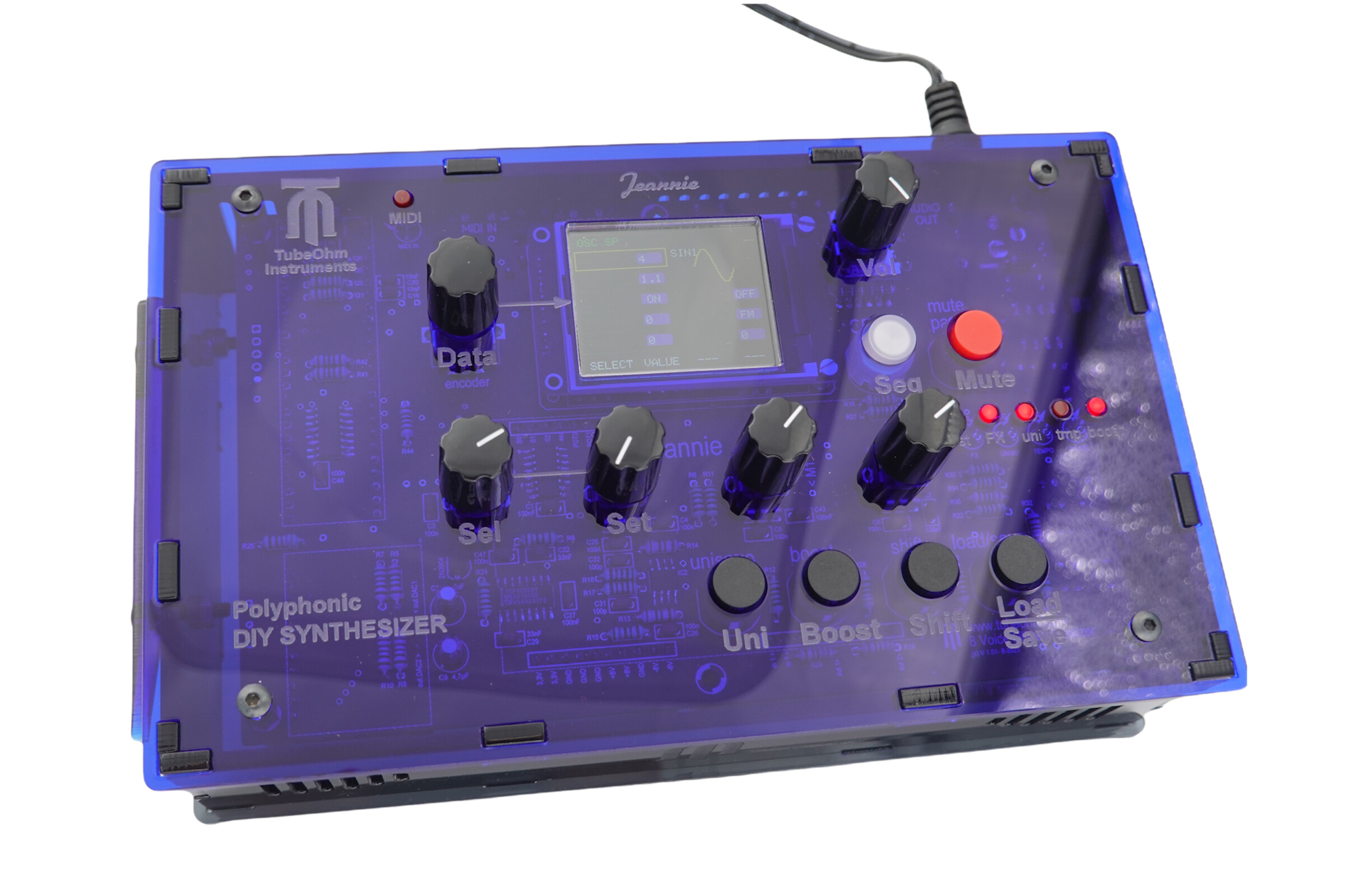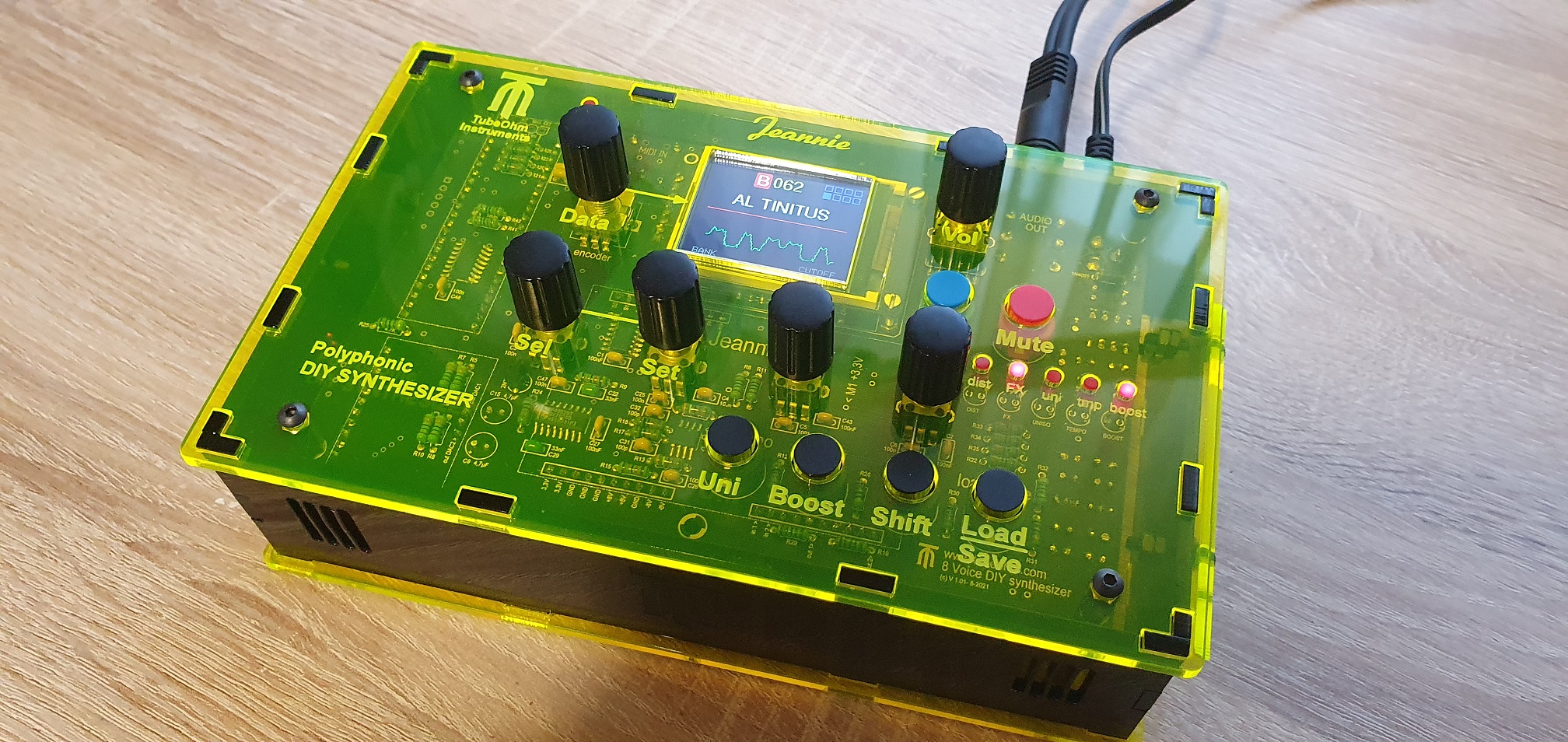 Jeannie is an 8-voice polyphonic open source synthesizer kit with digital sound synthesis and digital filters based on a Teensy 4.1. For sound generation, the user has a variety of classic and band-limited waveforms at his disposal. A pool of 15 waveform banks with 63 different waveforms each offer plenty of space for sound experiments. A waveshaper with different characteristics provides for gentle to vicious sounding distortions.