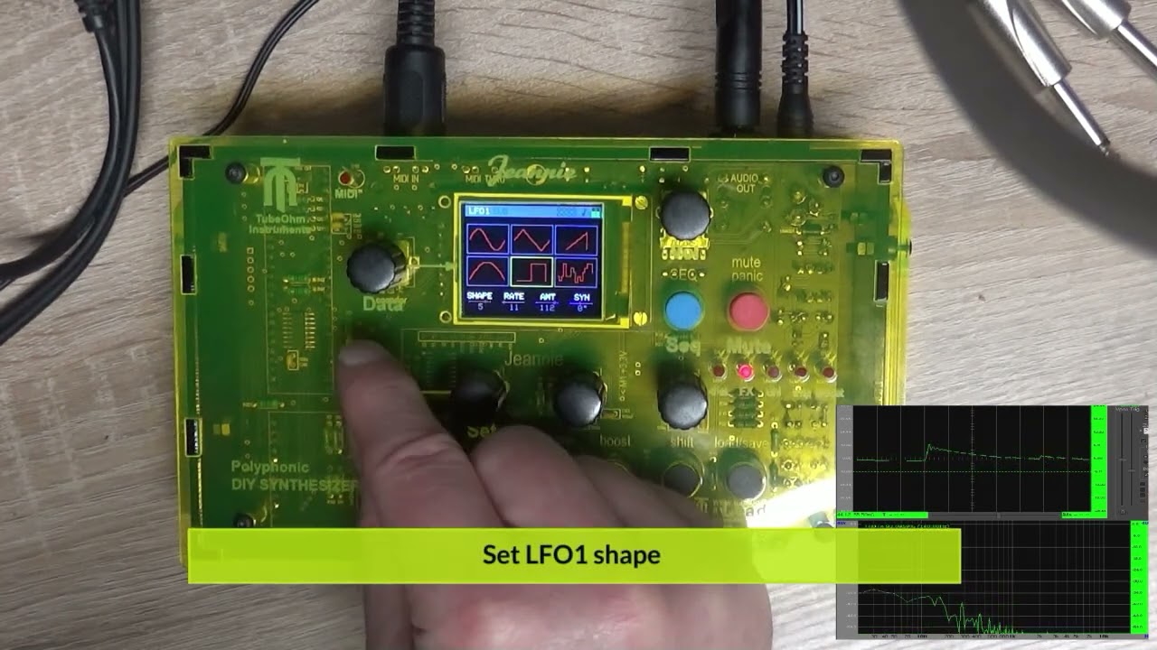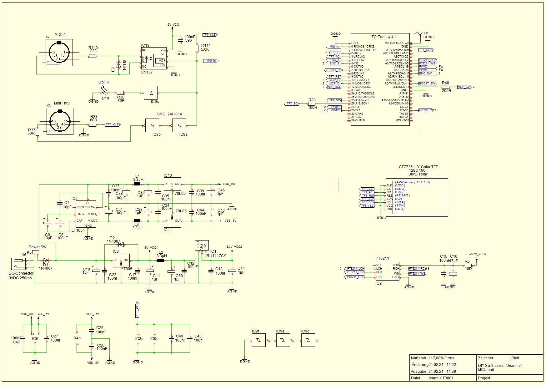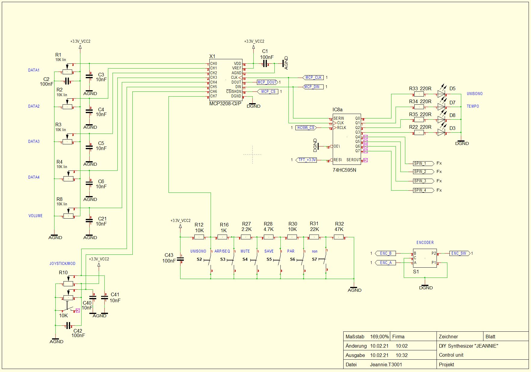Jeannie is an 8-voice polyphonic open source synthesizer kit with digital sound synthesis and digital filters based on a Teensy 4.1. For sound generation, the user has a variety of classic and band-limited waveforms at his disposal. A pool of 15 waveform banks with 63 different waveforms each offer plenty of space for sound experiments. A waveshaper with different characteristics provides for gentle to vicious sounding distortions.