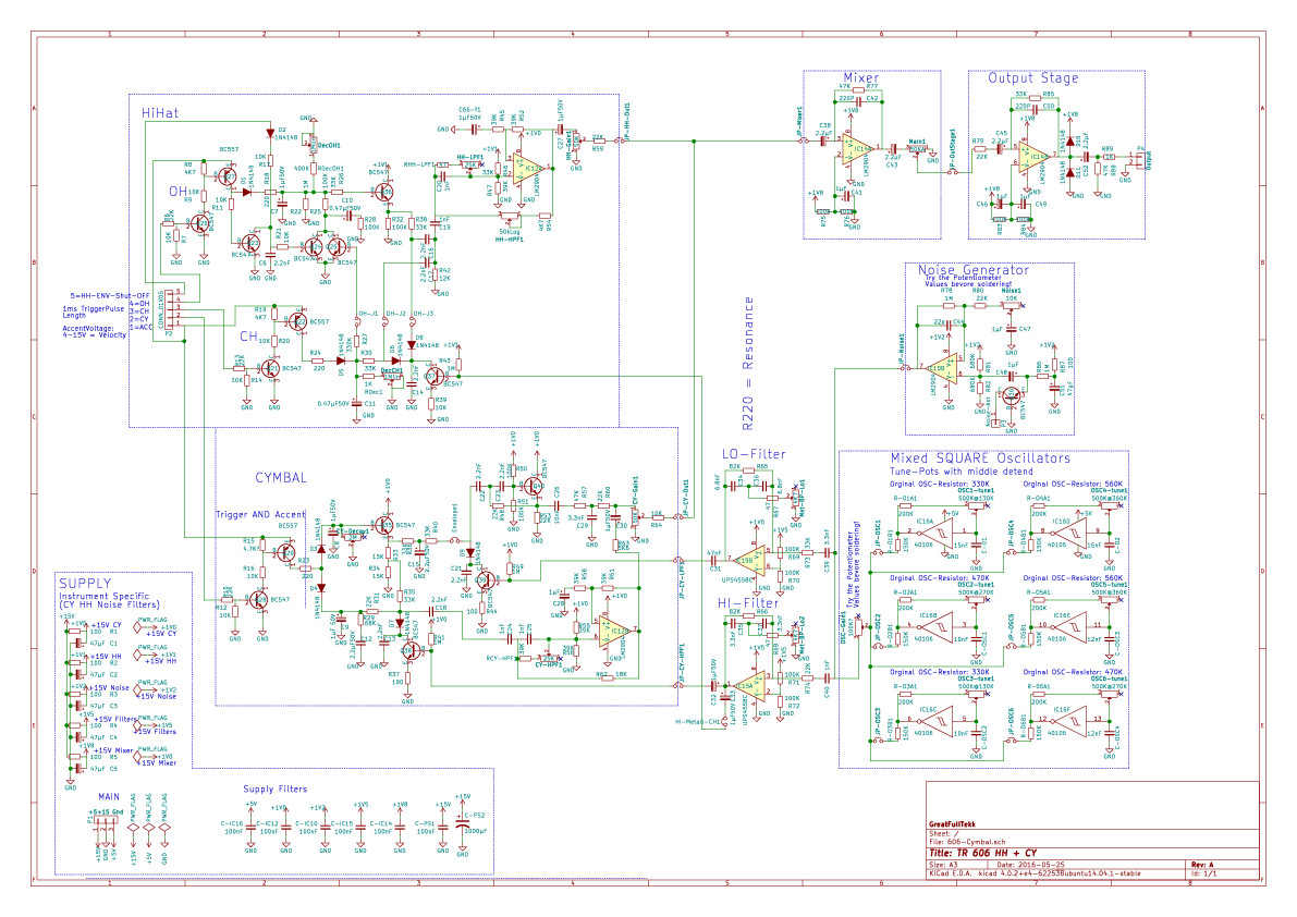 Closed/Open HiHat : Inputs : Trigger mixed with Common Accent to CY + Bandpass filtered out of the 6 Cymbal Osc. Concept : A VCA got twice envelope modulated by the outputs of the 2 envelope generator and the output of the VCA got High Pass filtered.