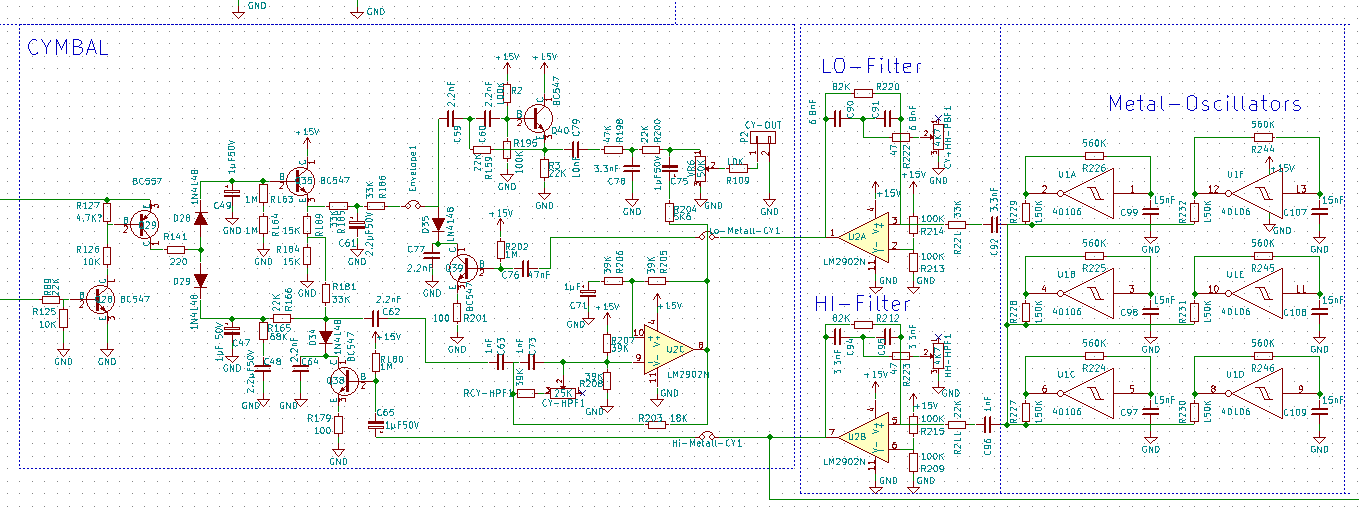 Cymbal : Inputs: Trigger mixed with Common Accent to OH/CH . Concept : 6 mixed Oscillators driving 2 BandPass Filters.These Bandpass Filters are driving 2 VCA. These VCA outs got High Pass Filtered and mixed.